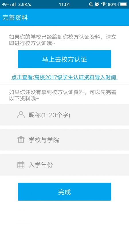 若学校已导入您的认证信息,则点击【马上去校方认证】,可以进行校方认证;若没有拿到校方认证资料,可以在如图所示页面填写学校、入学年份等信息