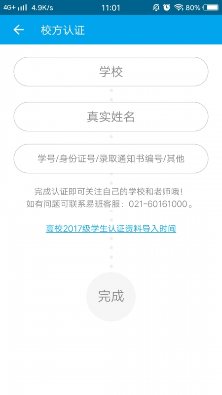 在如图所示页面填写学校、真实姓名和学号(或工号、录取通知书编号等),点击【完成】,完成校方认证
