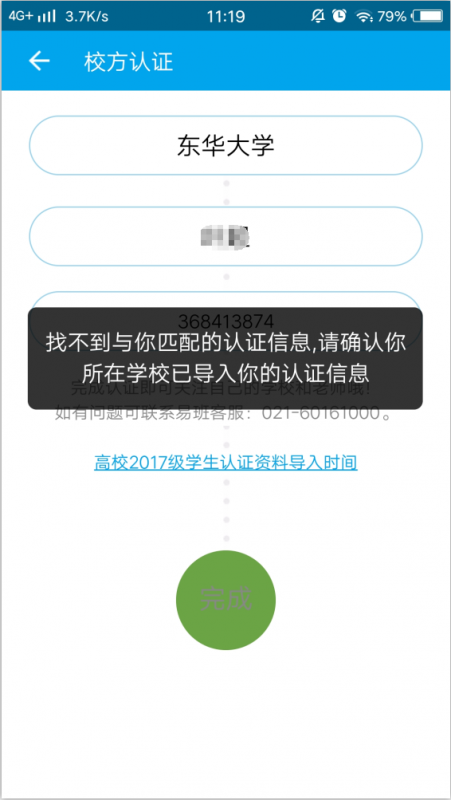 若在校方认证时,在点击【完成】后,提示如图所示信息,则说明学校还未导入您的校方认证信息,可点击【返回】先进行资料完善