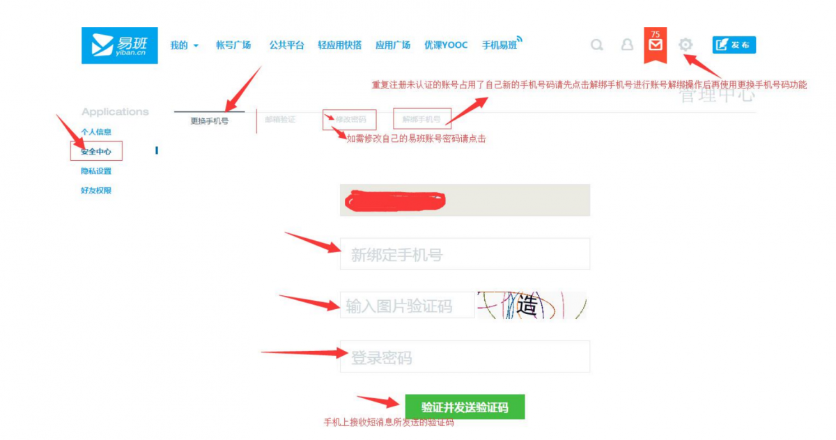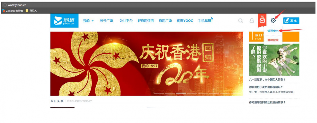 登录www.yiban.cn后,点击设置按钮进入“管理中心”页面