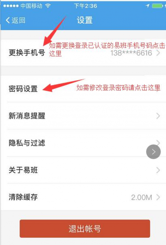 进入“设置”页面,可进行更换手机号、修改密码等操作;