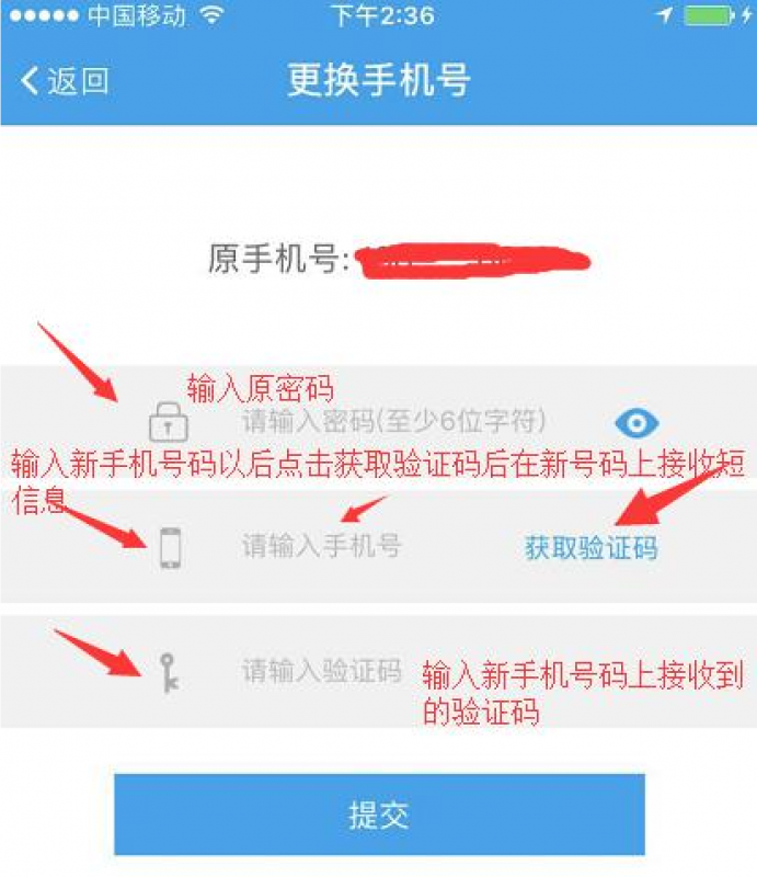 如图所示,点击“设置”页面的更换手机号,进入“更换手机号”页面;输入原密码、新手机号、密码进行更换