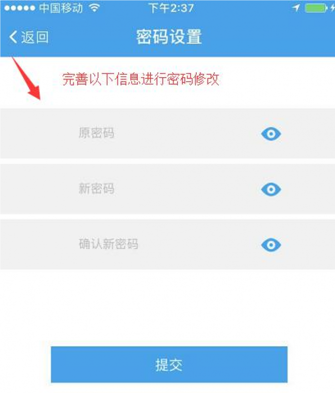 点击“设置”页面的“修改密码”进入如图所示修改密码页面,填写原密码和新密码,进行修改。(PS:进入设置页面见本教程第3、4页所示)